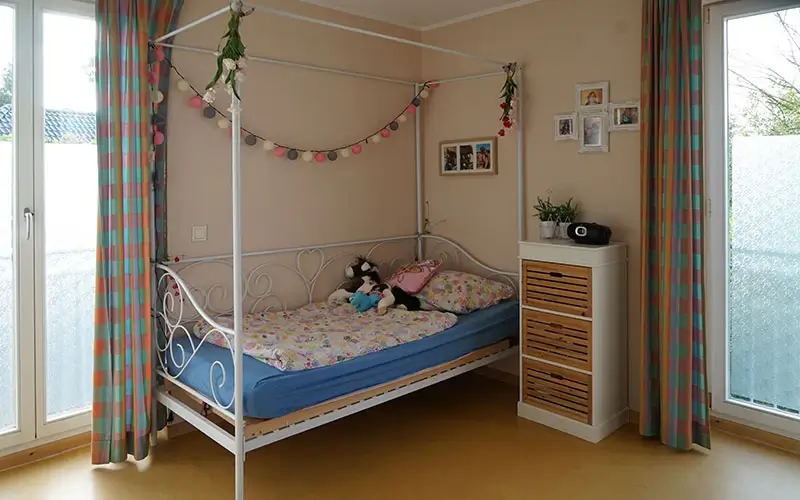 Mit dem Einzug hier sollte sich viel verändern. In jedem Haus leben acht Menschen. Jeder Bewohner hat natürlich sein eigenes Zimmer. Die Häuser sind selbst-verständlich rollstuhl-gerecht gebaut. Sie liegen in einem Neubau-Gebiet in Richtung Wyler. Der Orts-Kern von Kranenburg ist zu Fuß in etwa 10 Minuten zu erreichen.