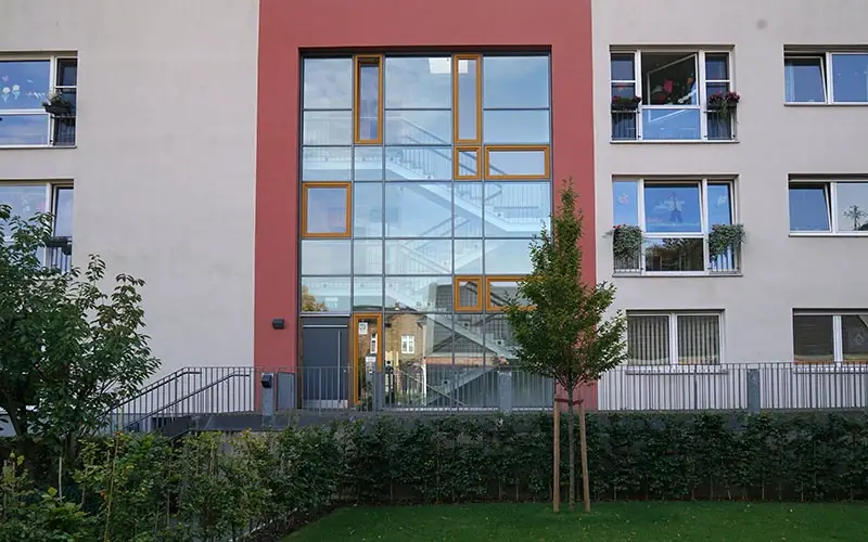 Das Haus in der Wanderstraße ist der größte und älteste Teil vom St. Johannes-Stift. Es wurde im Jahr 2000 vollständig umgebaut und neu gestaltet. Jetzt gibt es hier fünf Wohn-Bereiche. In jedem Bereich leben 10 Menschen zusammen.