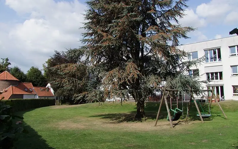Sehr schön ist auch der große Garten mit viel Platz zum Ausruhen, Spielen und Grillen. Im Sommer steht hier schon mal ein großes Zelt für Kunst-Angebote oder um darin zu schlafen. Viele Sommer-Feste sind hier auch schon gefeiert worden. Beim Märchen-Fest der Gemeinde Kranenburg war der Garten ein wichtiger Veranstaltungs-Ort.